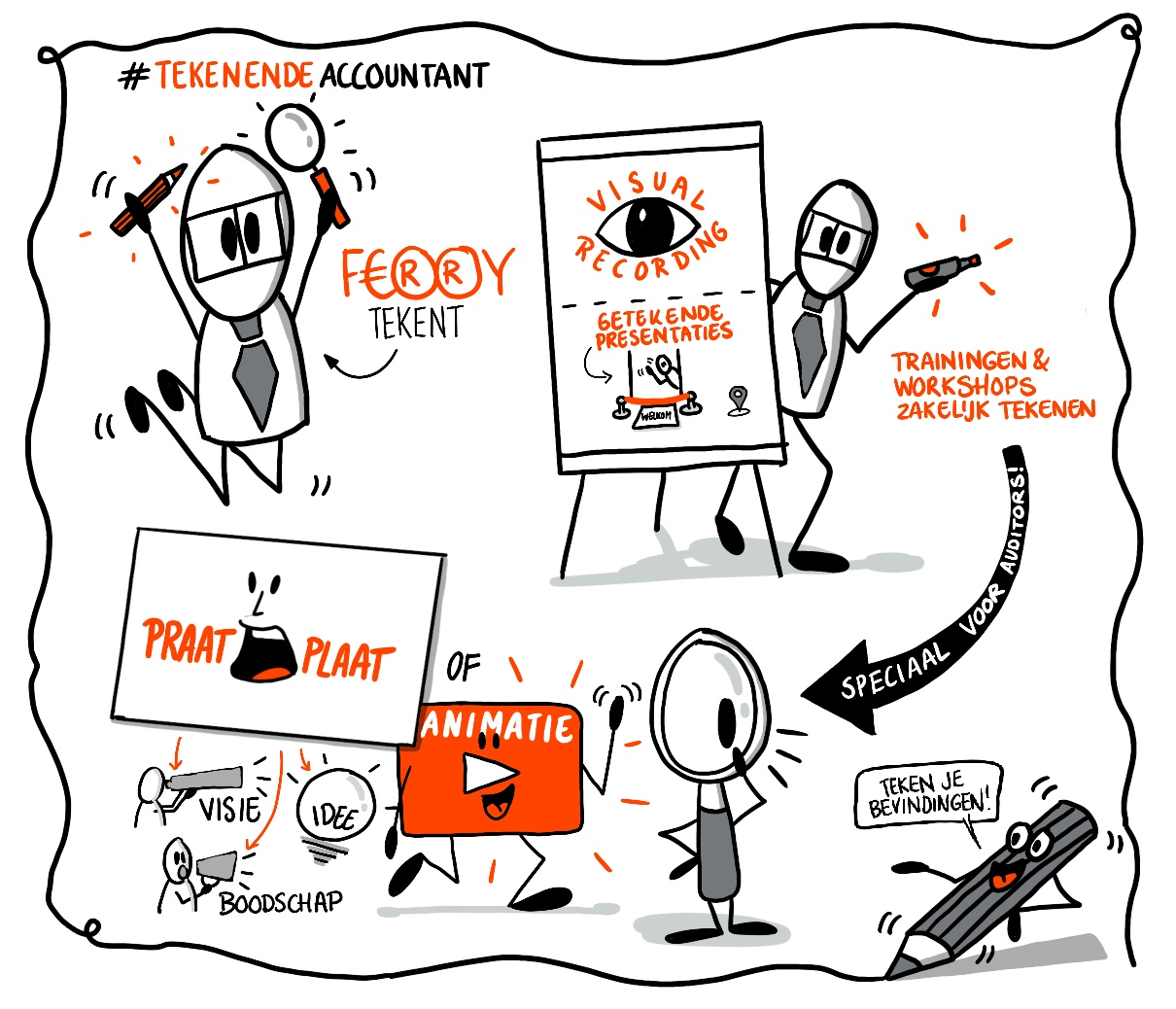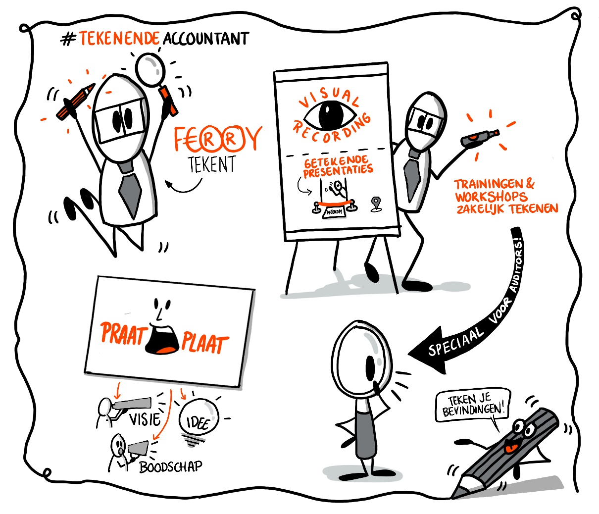 Wilt u uw visie, idee, doel of verhaal op een effectieve en krachtige manier overbrengen? Of de deelnemers van uw bijeenkomst trakteren op notulen die wél gelezen worden? Zoekt u een strategisch adviseur met visuele facilitator-skills voor uw bijeenkomst of project? Of wilt u zelf uw tekenvaardigheden verbeteren? Neem dan contact op met De Tekenende Accountant: Ferry Timp!