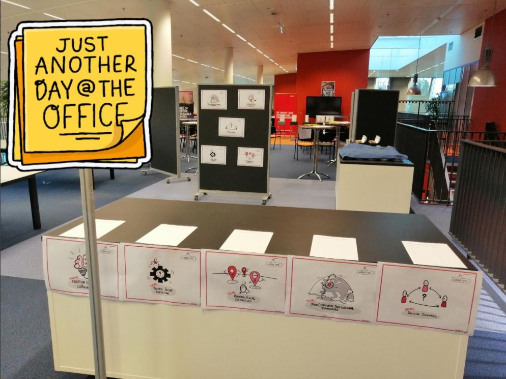 In de basis keerde ik toen huiswaarts met het verzoek: zorg dat je lekker meetekent en dat je aan het eind wat moois op het scherm kunt toveren 😉 Maar tijdens de voorbereiding kwamen er wat leuke plaatjes / halve posters ‘uit de pen’ en die deelde ik alvast met de organisatoren. Hahaha, die werden goed ontvangen en op de foto hieronder kan je zien hoe ik de locatie voor de graphic recording die ochtend aantrof 😀
