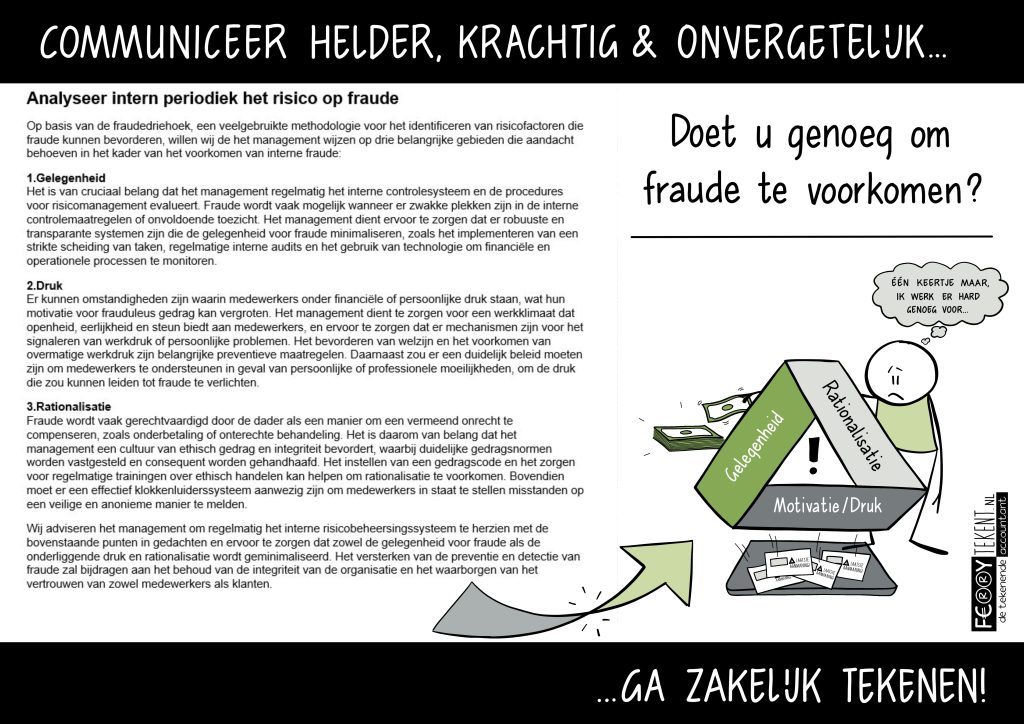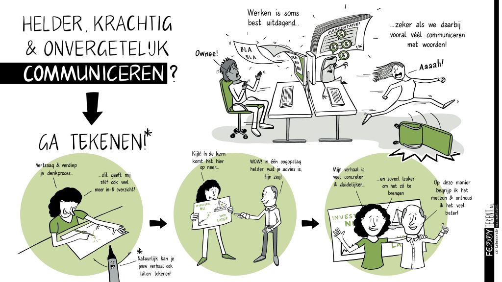 Het zette mij ertoe aan om in mijn werk als intern accountant mijn belangrijkste boodschappen te gaan tekenen voor de directie en het management. Door gebruik te maken van zakelijk tekenen kun je je belangrijkste boodschap visueel ondersteunen. Dit helpt niet alleen je ontvanger om je boodschap beter te begrijpen, maar zorgt er ook voor dat deze boodschap langer blijft hangen. Een beeld zegt immers meer dan duizend woorden, en dat is in dit tijdperk van informatie overload een cruciale troef.