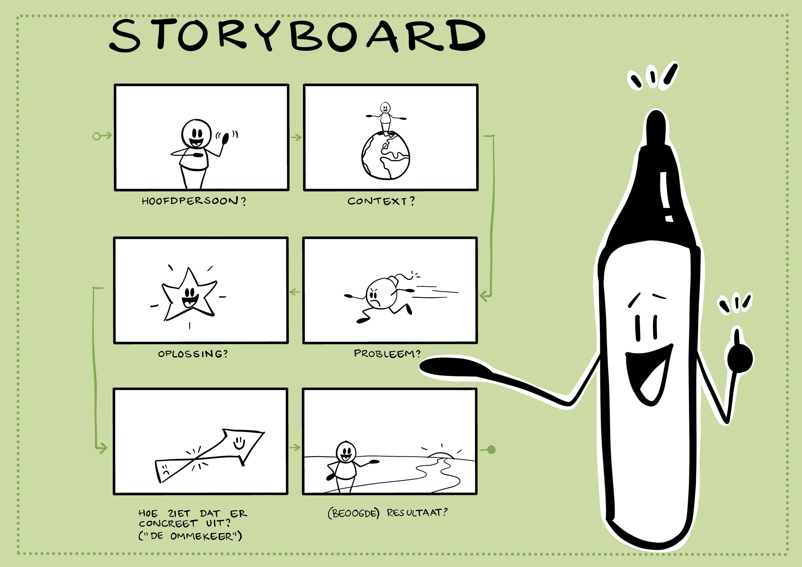 Om een animatie te maken doorlopen we een gezamenlijk proces. Ik treed hierin op als uw facilitator. Dit proces kent uiteindelijk een professionele animatie inclusief voice-over en ondertiteling als eindproduct. Maar om daar te komen worden ook een aantal belangrijke tussenproducten gemaakt, waaronder een storyboard een een script voor de voice-over acteur.