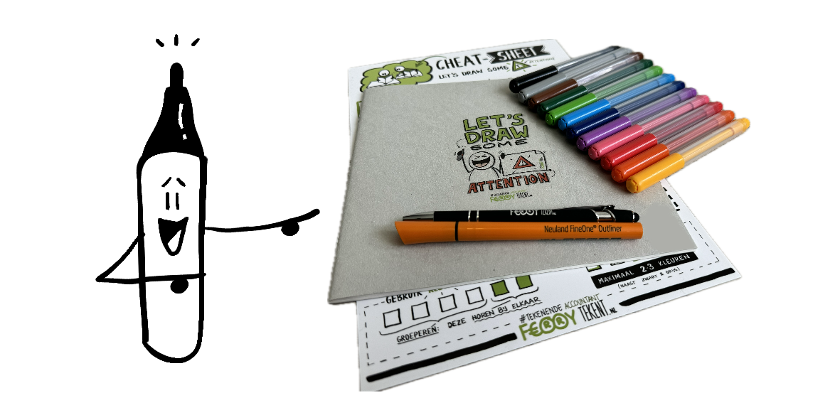 Tijdens de training ontvangen de deelnemers van mij inspiratiemateriaal, waaronder een ‘Cheat-Sheet’. Na afloop van de training ontvangen deelnemers nog een mail met daarin tips, inspiratie en ‘facultatief huiswerk’ om ze in ieder geval de mogelijkheid te bieden om te blijven tekenen!