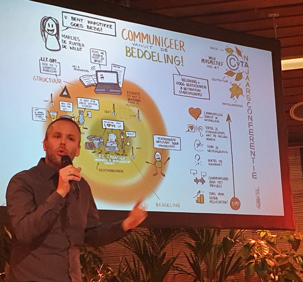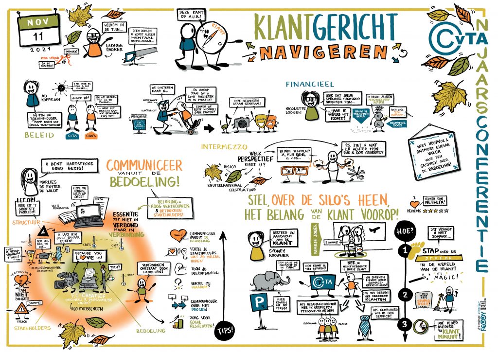 Op donderdag 11 november 2021, een dag voordat er weer een nieuwe persconferentie kwam die aan een bijeenkomst als deze voorlopig weer even een eind zou maken, mocht ik op pad richting onze hoofdstad. Om die middag een Visual Recording uit te voeren tijdens de Najaarsbijeenkomst van het CvTA over “Klantgericht navigeren”.