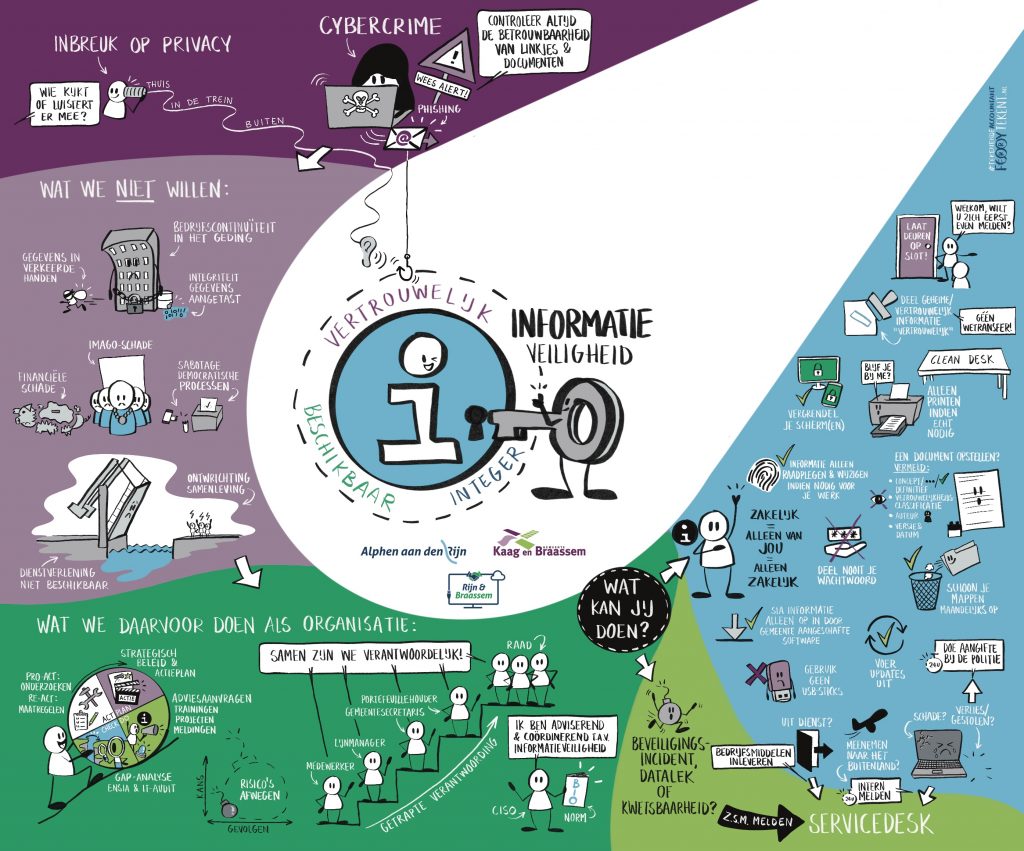 Daar weet Evelien Houweling, Chief Information Security Officer (CISO) voor de gemeenten Alphen aan den Rijn & Kaag en Braassem wel raad mee! Zij benaderde mij om hun strategisch beleid informatieveiligheid om te zetten naar tekeningen. Met een heel leuk idee: “Ik wil de tekening gebruiken om aan de hand daarvan intern de bewustwordingstraining Informatieveiligheid te kunnen geven. En dan laat ik de tekening ook nog op een muismat afdrukken, die krijgen de deelnemers dan na afloop mee (of in deze tijden via de post toegestuurd”!