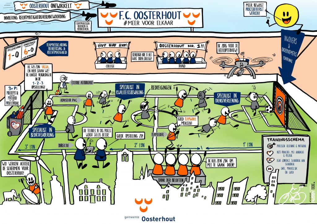 In juni 2021 meldden de interne auditors van de gemeente Oosterhout zich bij me. Ze wilden heel graag in de organisatie het gesprek voeren dat goede interne controle vooral in de basisprocessen van de organisatie aanwezig moet zijn. Aanleiding voor dat gesprek was ook de aankomende wettelijke verplichting voor een rechtmatigheidsverantwoording. Om dat gesprek te ondersteunen, waren ze op zoek naar een getekende praatplaat. En omdat ik ook jarenlang als intern accountant bij de gemeente Leiden werkzaam ben geweest, kwamen ze voor zo’n praatplaat bij mij…
