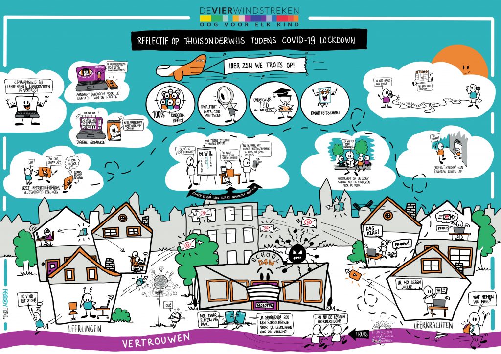 Het leverde een heleboel mooie verworvenheden en best practices op. Deze werden onlangs samengevat om te kunnen bespreken met alle directeuren van de aangesloten scholen. En om die bespreking nog leuker te maken kreeg ik het verzoek om, in lijn met de wijze waarop ik eerder al hun Strategische Koers had gevisualiseerd in een praatplaat, ook hiervan een praatplaat te maken.
