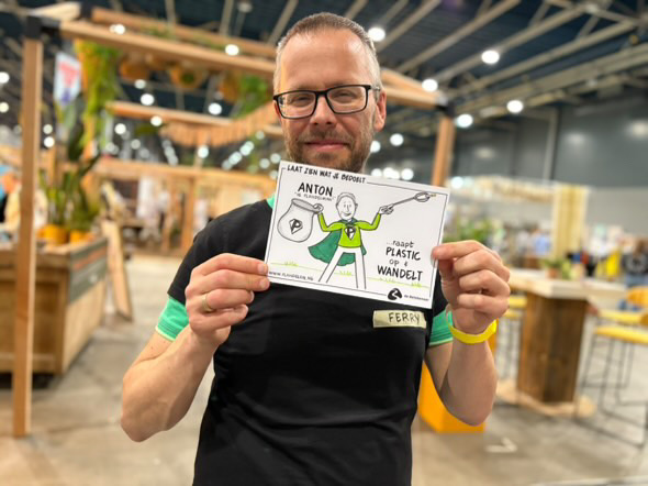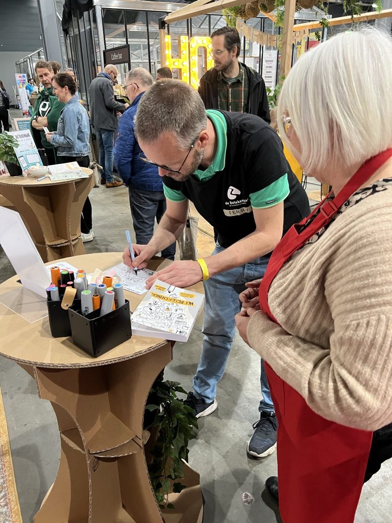 We wisten niet wat we konden verwachten. Zouden mensen met een grote boog om onze stand heenlopen? Kregen we überhaupt wel bezoekers of zouden we de hele dag anders maar bij alle talks op de verschillende podia gaan zitten? Nou, niets van dat alles: wát een gezellige drukte hebben we op alle 3 de beursdagen ervaren! We hebben heeeeeeeeeel veel (verschillende) verhalen mogen optekenen! Ons geheim? Spekjes! Maar nee, het bleek ook gewoon dat mensen deze vorm van communiceren met tekeningen heel leuk vonden. Verschillende bezoekers of ‘collega-exposanten’ kwamen ook bij ons langs “omdat ze óók hun verhaal zo mooi opgetekend wilden hebben” zoals hun collega al had. Maar ook diverse sprekers kwamen voorafgaand of na afloop van hun ‘optreden’ bij ons langs.