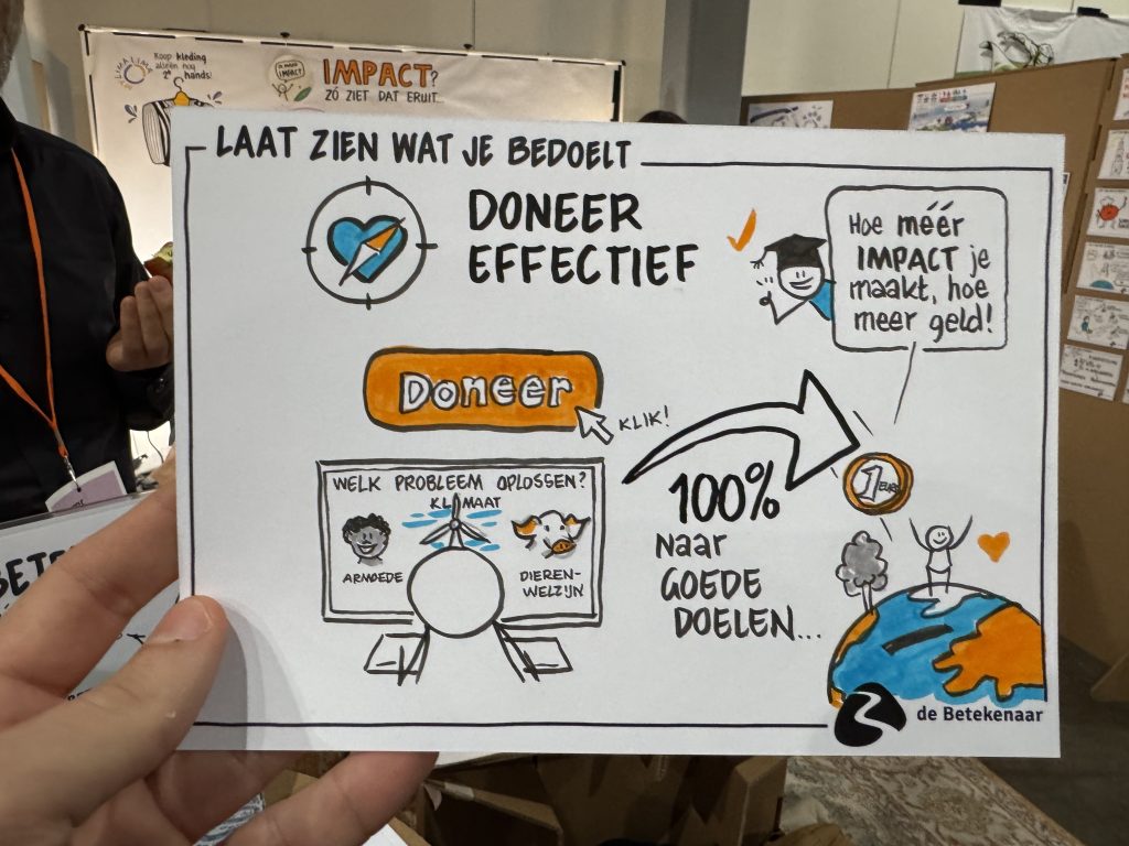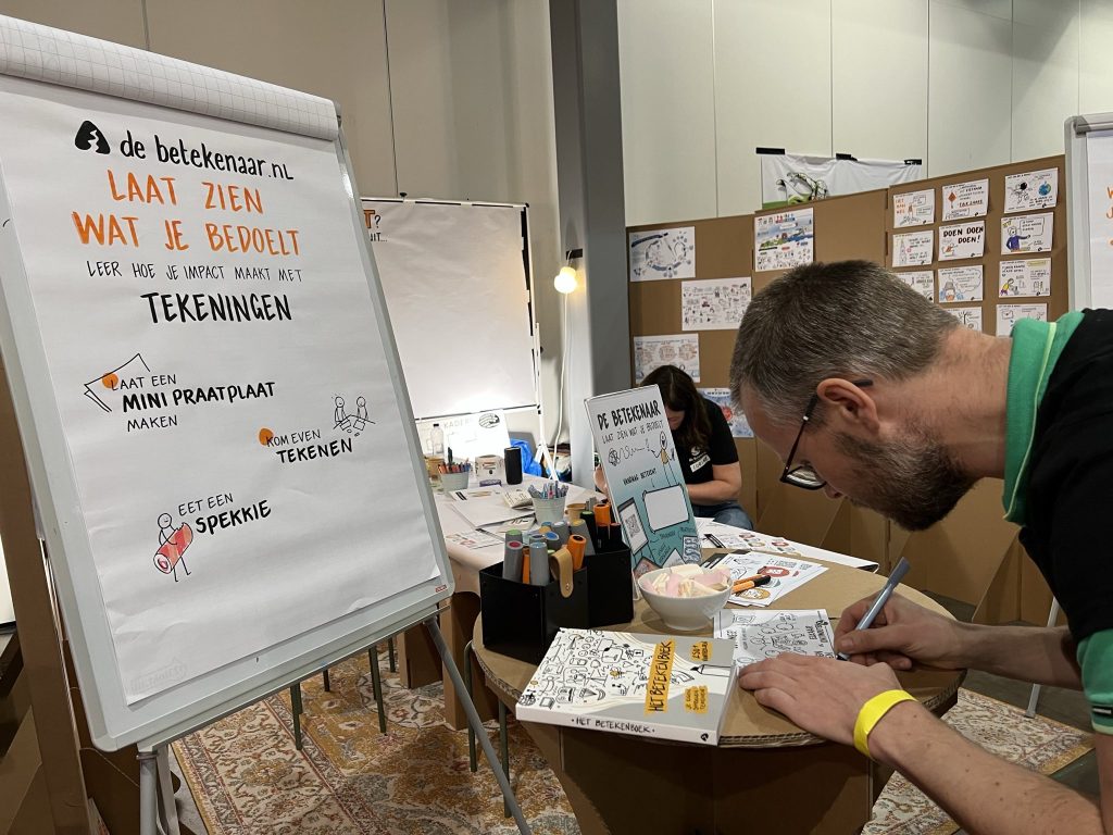 En wat begon met een gesprek over wederom de Impact Fair 2025 als stageopdracht voor onze training te kiezen, resulteerde tijdens het gesprek al snel in een enthousiast voorstel van Micha om te gaan voor een eigen stand van De Betekenaar op de Impact Fair. Om bezoekers te laten ervaren welke impact het visueel communiceren met tekenen kan hebben. Om te laten zien wat voor gave dingen we daar als De Betekenaar al mee doen. En natuurlijk zou het ook te gek zijn als we dan ook gelijktijdig van een aantal ’talks’ een visueel verslag konden maken.