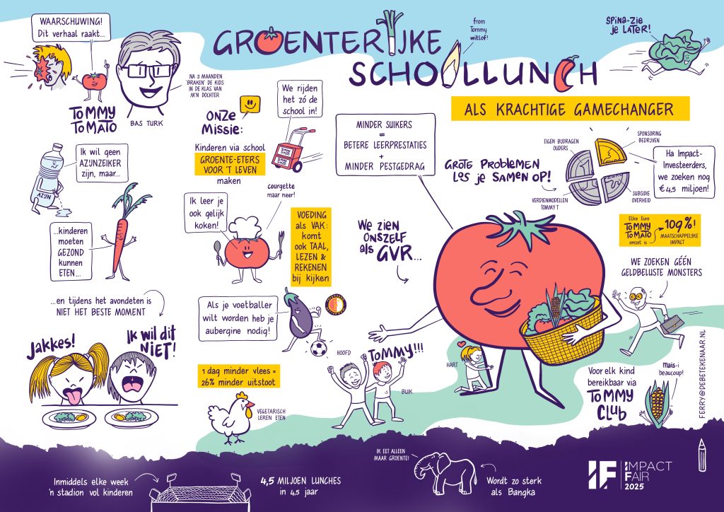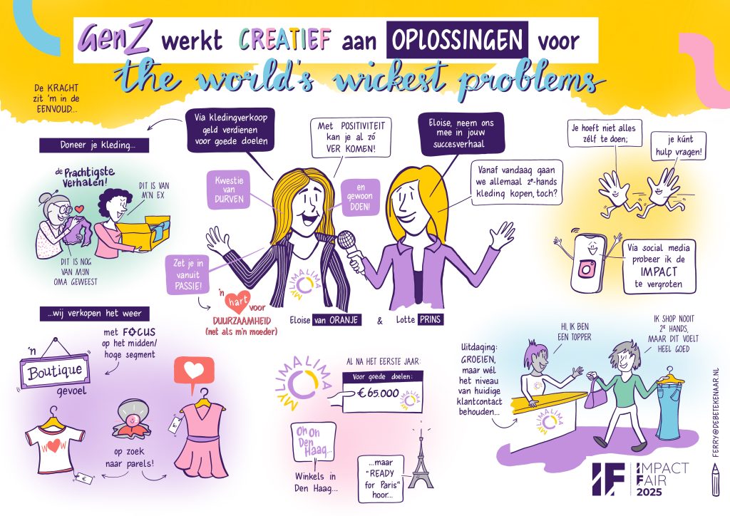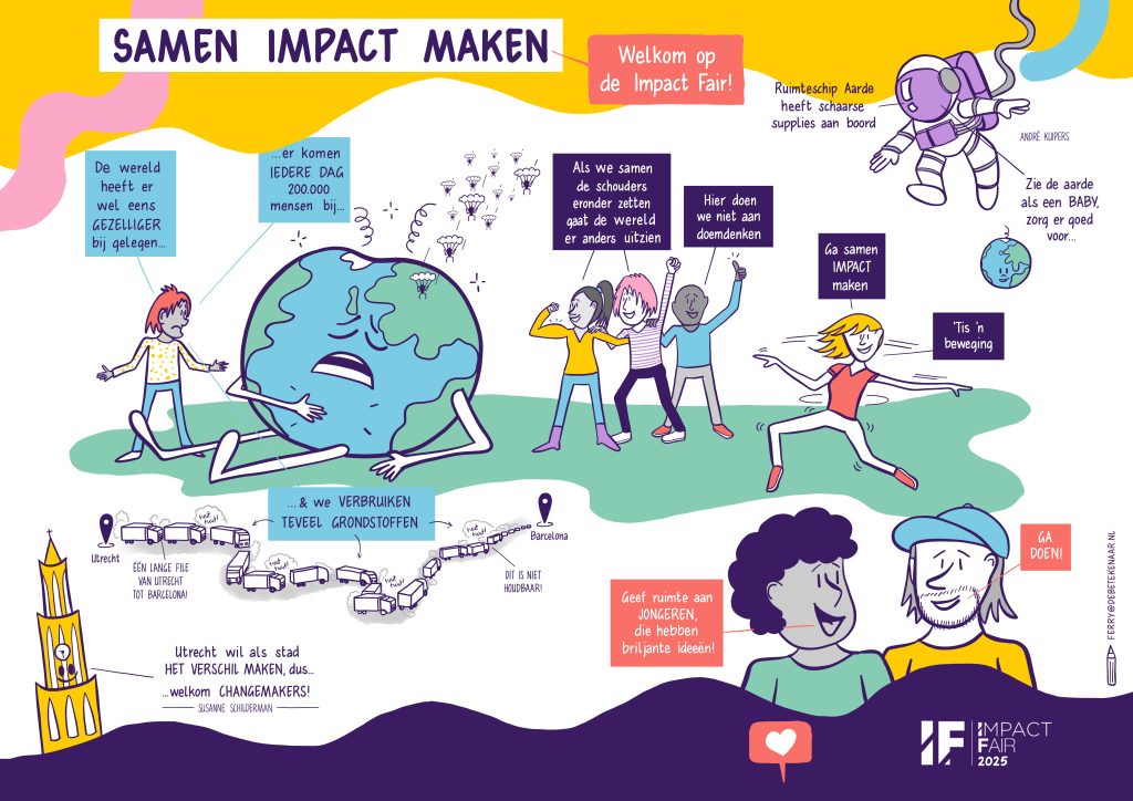 Hoe kwamen we hier zo terecht? Dat begon vorig jaar. Mijn collega Corine en ik gaven toen onze 4-daagse training Visual Recording en de allereerste editie van de Impact Fair werd toen in 2024 georganiseerd. Dit bleek een mooie stageopdracht te zijn voor onze deelnemers om ‘in ’t echie’ te kunnen oefenen met het meetekenen van een bijeenkomst. Micha van Hoorn, de initiator van de Impact Fair, bleek zó enthousiast over deze vorm van visueel verslagleggen dat we afspraken om richting 2025 weer contact te hebben over wederom een stageopdracht.