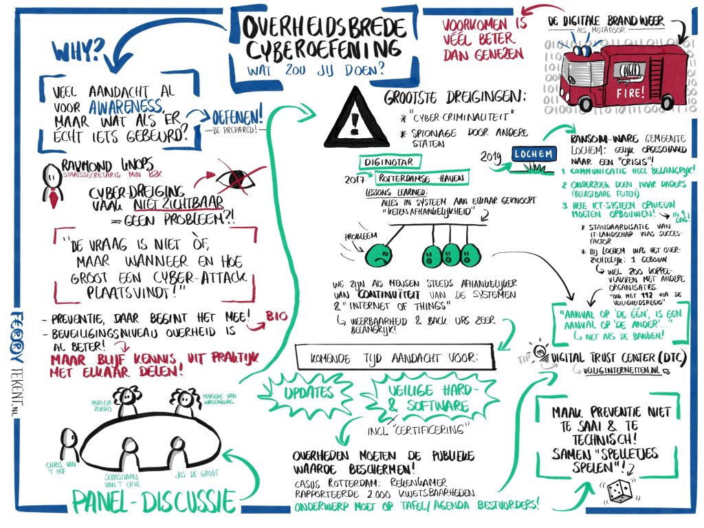 De visuele notulen maakte ik wederom voor mezelf, maar zoals inmiddels ‘gebruikelijk’ deelde ik deze na afloop op LinkedIn. De projectleider van de Overheidsbrede Cyberoefening (Margot van der Linden) benaderde me en vroeg of ze notulen mocht delen, omdat ze zo mooi de dag samenvatten! Zie ook haar post op LinkedIn. En mijn visuele notulen kregen een plekje in het verslag van de dag dat na afloop is gemaakt. Super leuk!