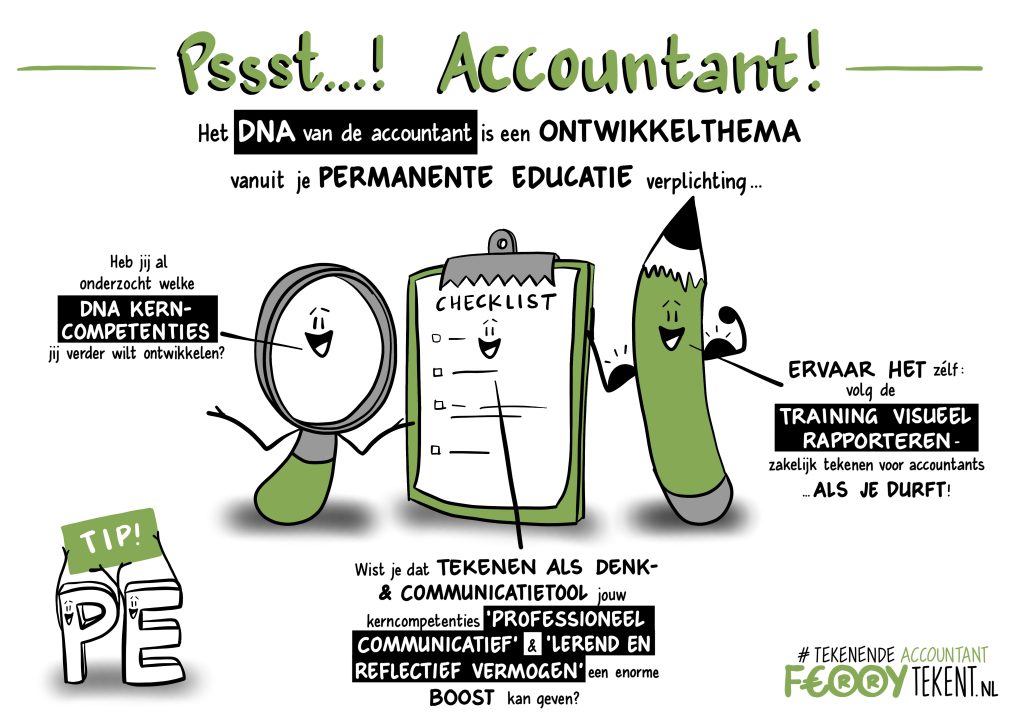 Ik ben zelf vanuit mijn functie als intern accountant ooit met tekenen begonnen omdat ik behoefte had aan een alternatief voor mijn rapporten. Mijn praktijkervaring als accountant én mijn vaardigheden vanuit het tekenen heb ik gecombineerd in een training die speciaal bedoelt is voor accountants / auditors: Visueel Rapporteren – zakelijk tekenen voor accountants.