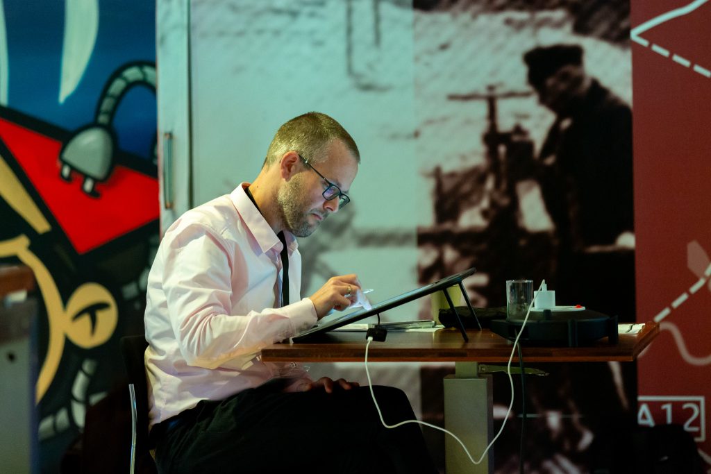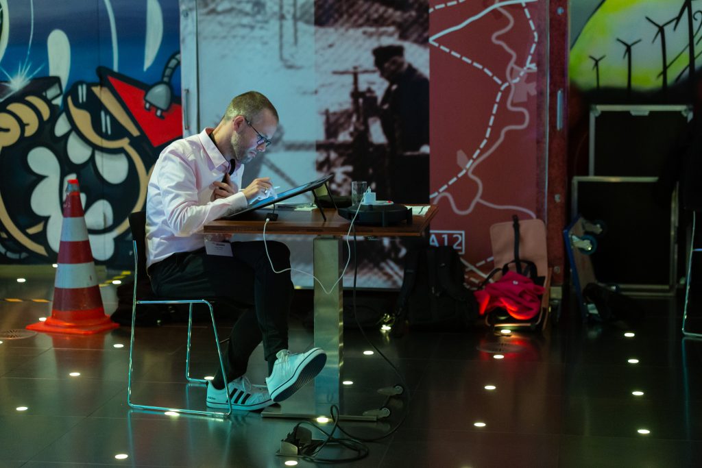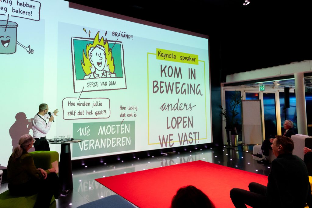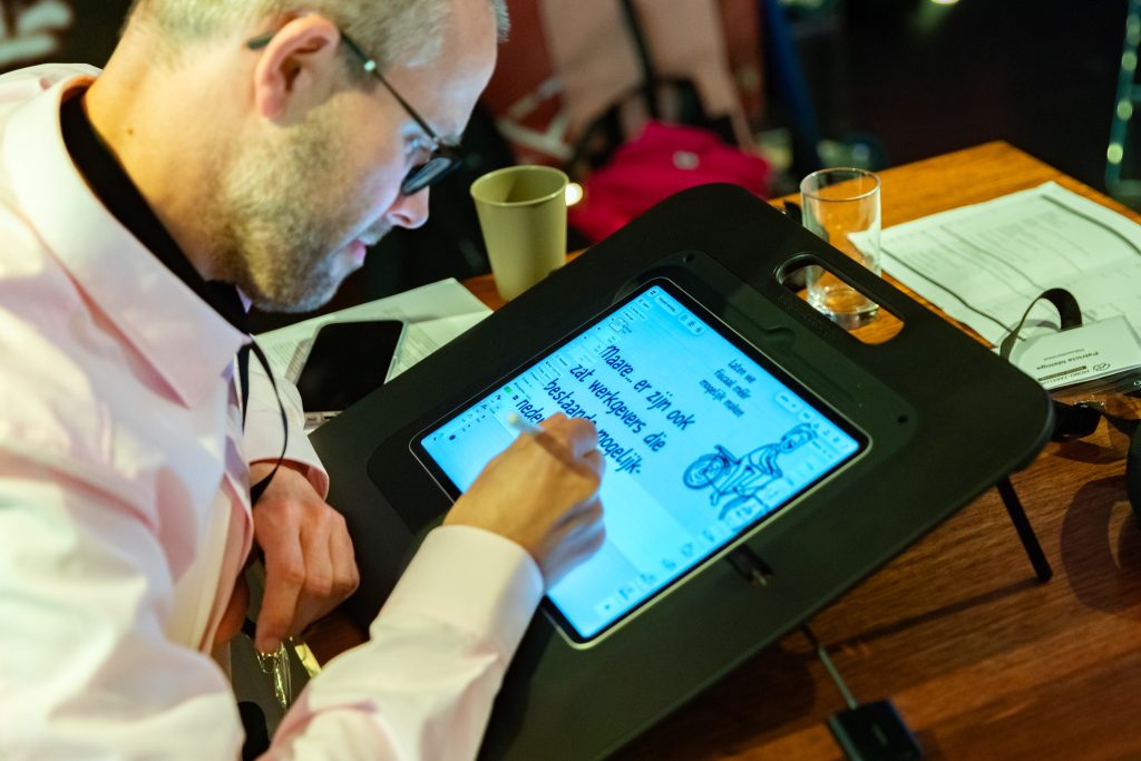Op de foto’s hieronder (gemaakt door Maarten Ederveen) zie je mij in actie bij één van de diensten die ik aanbied: het maken van een visueel verslag bij bijeenkomsten. Ik doe dat zowel vanuit mijn eigen bedrijf Ferry Tekent | De Tekenende Accountant als via de Betekenaar. Ik filter de kern/essentie van wat er tijdens de bijeenkomst wordt gedeeld en vertaal dat naar beelden in één verslag. Niet bedoeld als ‘decoratie’ of ‘entertainment’. Maar een tekening die helpt om de inhoud te begrijpen, te onthouden én na de bijeenkomst aan de hand van de tekening door te kunnen pakken.