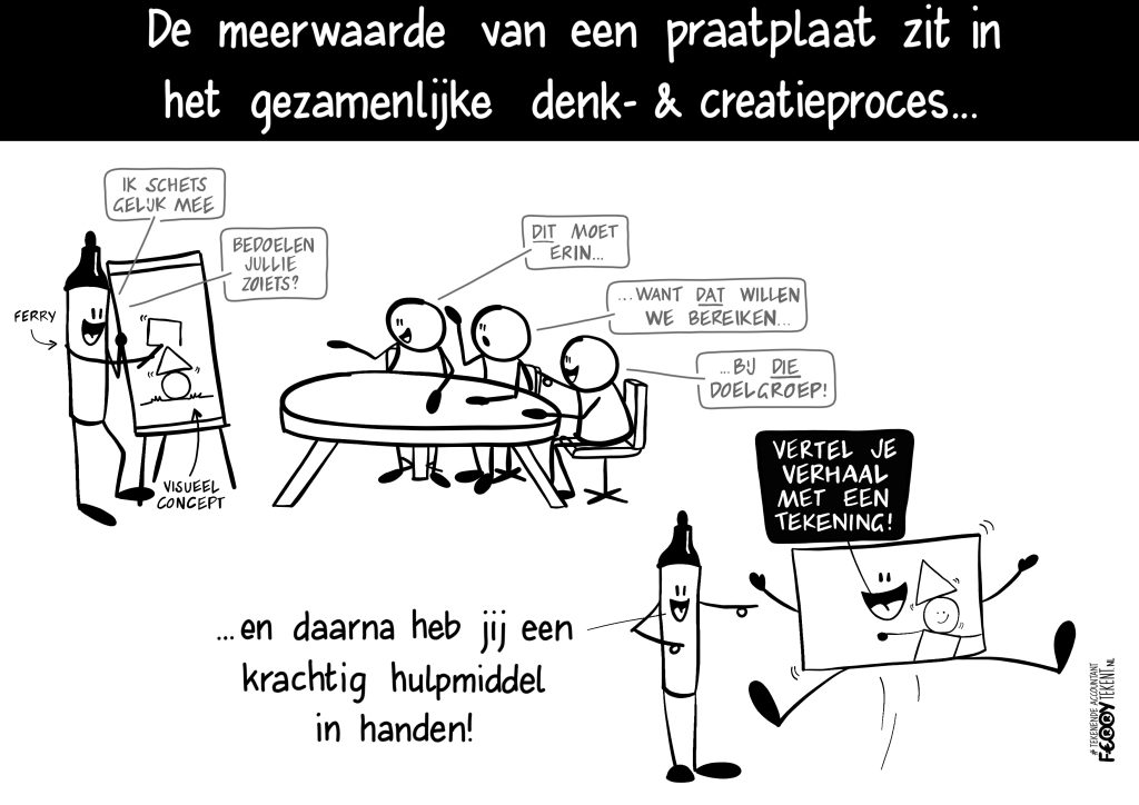 De échte waarde van het maken van een praatplaat zit in het proces dat we samen doorlopen als we de praatplaat gaan maken. Dat proces is vooral gericht op samen denken en creëren. Het tekenen is daar ondersteunend aan. Zo krijgen we samen scherp: wat is hier écht belangrijk? Wat is daarvan de kern? Wat laten we weg? Welk effect moet de plaat en het verhaal erbij hebben op de belangrijkste doelgroep?